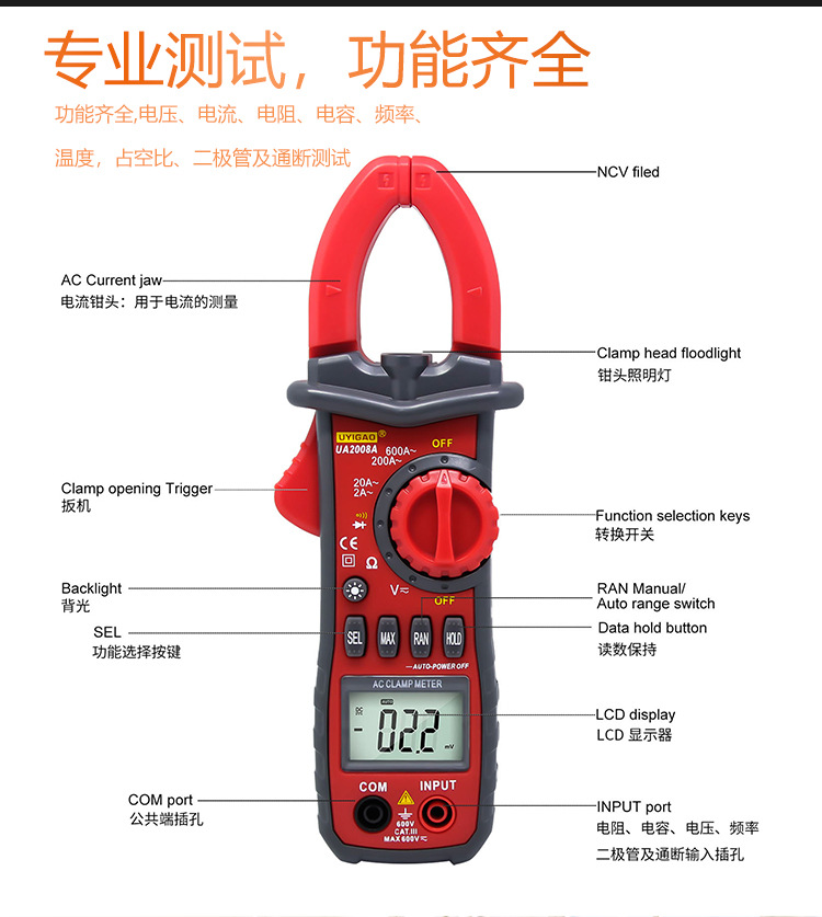優儀高雙開數字鉗形表小鉗形萬用表數顯式電圧表UA2008B